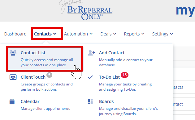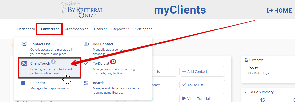 Click Contacts and then ClientTouch in the myClients toolbar.